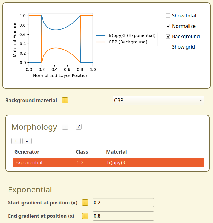 CBP is used as the host material and is therefore set as the background material. We will use a Linear generator to create a static Ir(dmp)3 fraction of 0.1. The Trapezoid is used to add an Ir(ppy)3 gradient at the edges. The Exponential gradient is used to add a dense Ir(ppy)3 region to the center of the layer.