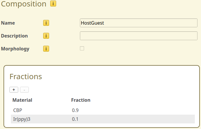 button to add 2 materials to the Fractions table. The first material will be set to CBP, the second material will be Ir(ppy)3. We use a fraction of 0.9 for CBP and a fraction of 0.1 for Ir(ppy)3. We use the Save composition button to add the composition to the project.