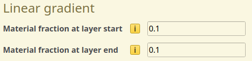 For the linear gradient, the material fraction is specified at the layer edges. A linear interpolation is used to determine the fractions at the interior gridpoints. For this example, we will have the gradient range from a fraction of 0.2 at the start of the layer, to a fraction of 0.8 near the end of the layer.