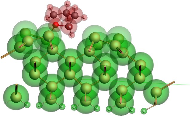 Due to the electrophile nature of Sidown the THF molecule was then added on top of this site with its O-atom oriented towards Sidown. Afterwards, the resulting adsorption complex was relaxed to yield the structure provided for this tutorial.