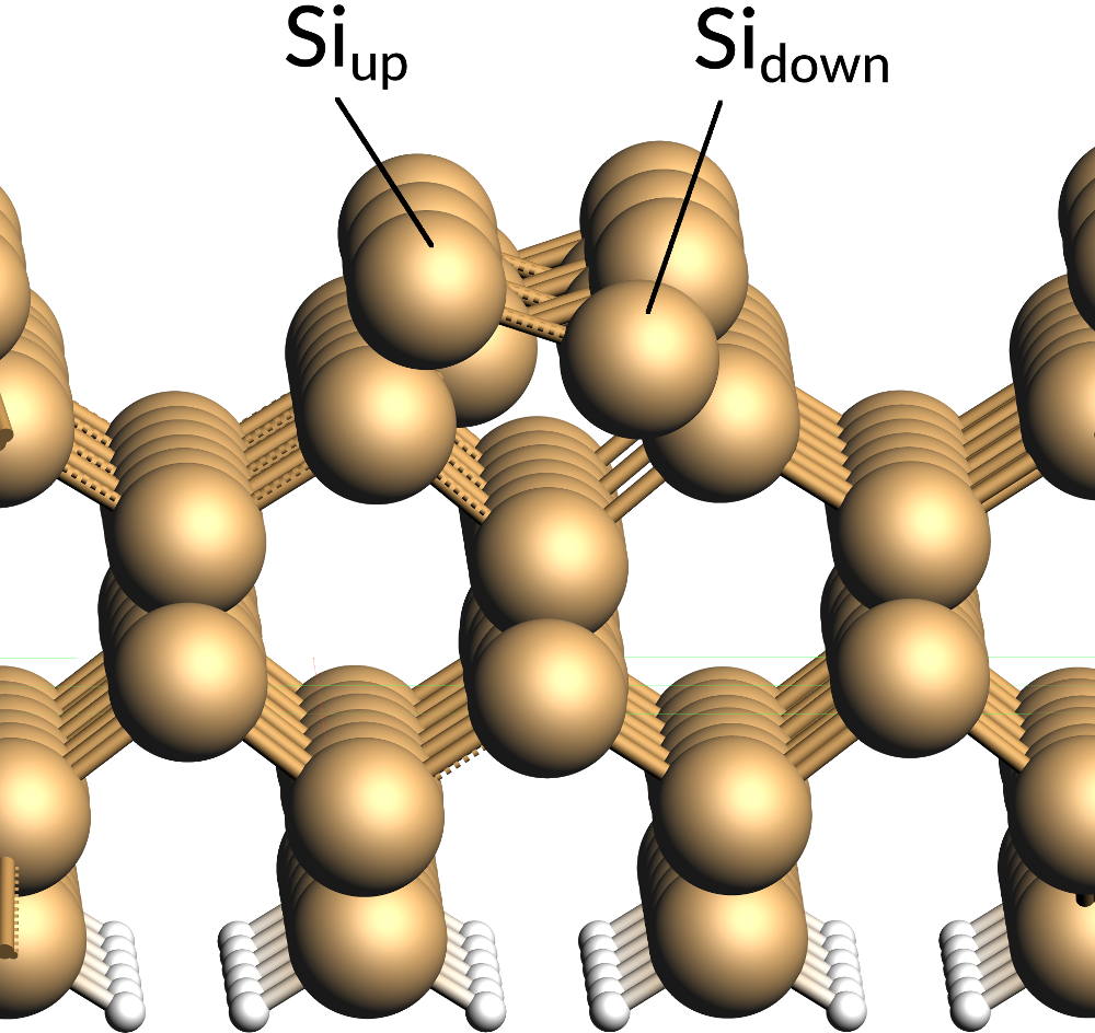 This structure was obtained by cuts along the [001] Miller plane in order to create a six-layer slab. The atoms at the bottom of this slab was then saturated by adding hydrogen atoms at the experimental Si-H bond length of Silane (1.48 Å). The unit cell was extended to form a 2x4 supercell model. This resulting slab model was then relaxed while keeping the bottom two Si-layers and the hydrogen atoms fixed. On the surface of the slab there are two exposed Si-atoms, which form a characteristic alternating buckled structure. A further analysis reveals that this buckling (or symmetry breaking) is the consequence of each of the exposed Si-atoms having an unpaired electron. In consequently, one of these unpaired electrons transfers to the neighboring Si-atom and forming a lone pair with the other unpaired electron there. The Si center where the lone pair is located becomes more nucleophile and gets pushed upwards (Siup) while its more electrophile neighbor (Sidown) moves slightly towards the slab.