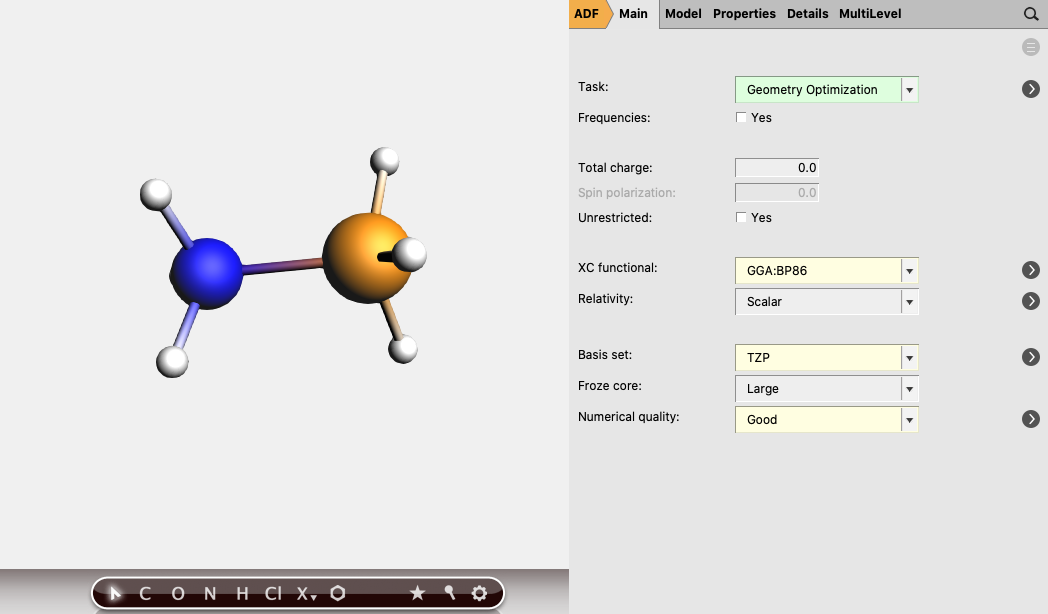 To calculate \(\Delta E\), the energies of optimized NH3, BH3 and H3N-BH3 need to be calculated. Note that another basis set and functional can be used as well. Symmetry will be used, which may help in the analysis. Open AMSinput (SCM → New Input), and perform the following steps: