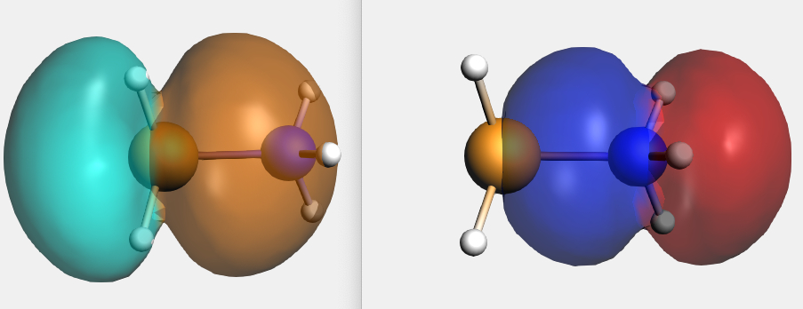 α-Δρ ΔE=-80 kcal/mol (|v|=1.00), electron‐sharing π bond caused by drops in both ΔT=-36 kcal/mol and ΔV=-44 kcal/mol. The transfer of a whole electron (|v|=1.00) indicates that there probably is an electron configuration of the fragments that may be better ‘prepared for bonding’, however, that will not be investigated here further.