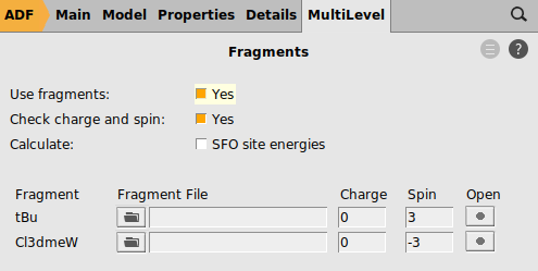The fragment [Cl3(dme)W]-1 has problems with SCF convergence. It is difficult (or impossible) to converge the SCF with an aufbau solution. Therefore one can use an explicit non-aufbau electron configuration. Note that the following is an expert option. If you do not include the next expert steps you may get a different non-aufbau solution, and thus a different energy decomposition analysis for Cl3(dme)W-CCMe3 for this case of charged fragments.