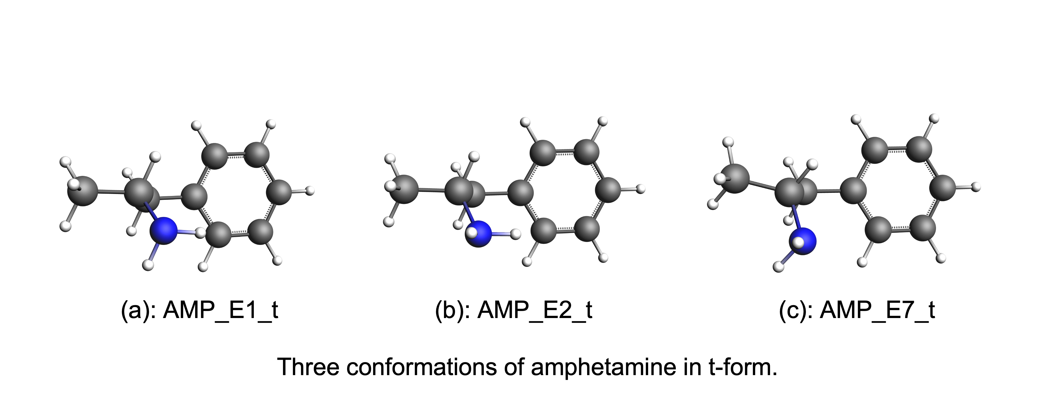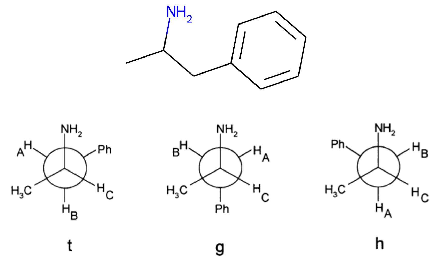 In this example, we will investigate the differences in conformer populations of amphetamine between water and chloroform solvents. Additionally, we will look at how the partition coefficient is affected by accounting for the conformers of amphetamine. Amphetamine has three conformers, denoted in the literature [3] as the t-form, g-form and h-form. These are shown below.