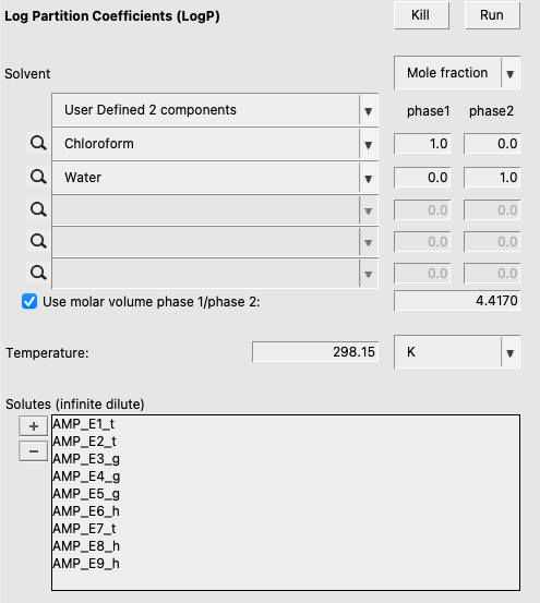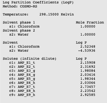 We can additionally do a logP calculation for every individual conformation. Simply delete the .multiform file from the solutes window, add all the individual .coskf files, and then click run. The results show that the calculated logP ranges from 1.98 to 2.92 for the different conformations.