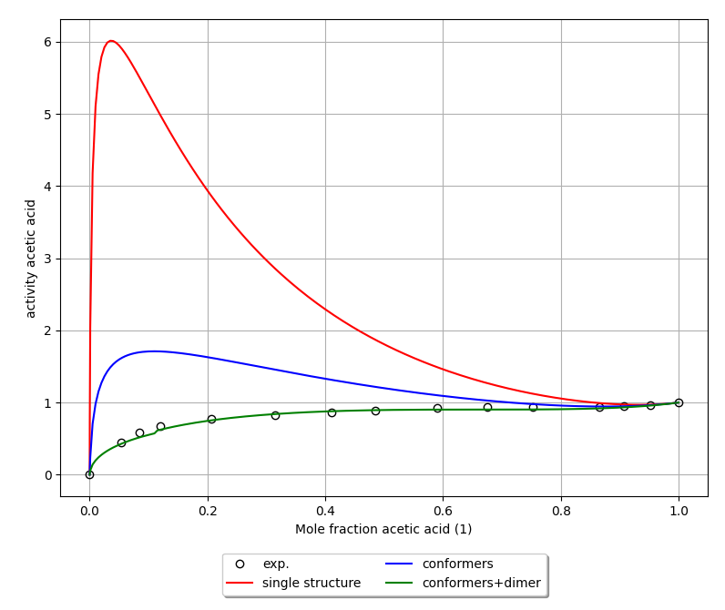 Finally, we can compare the calculated activities to experimental values [1] among 3 scenarios: (1) using a single structure for acetic acid that is also not the lowest energy conformer; (2) using two conformers for acetic acid; and (3) using both conformers and the dimer.