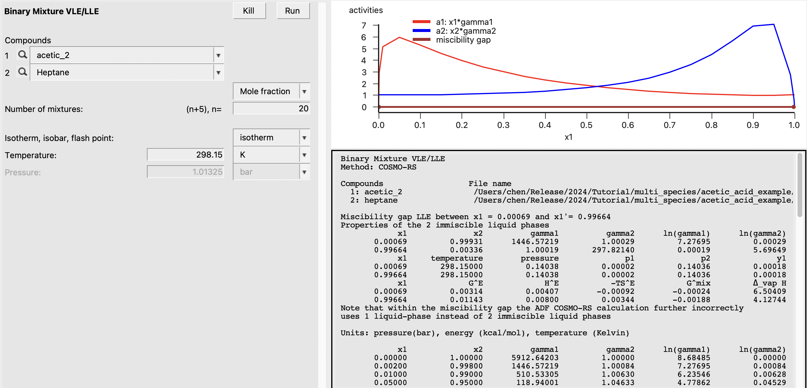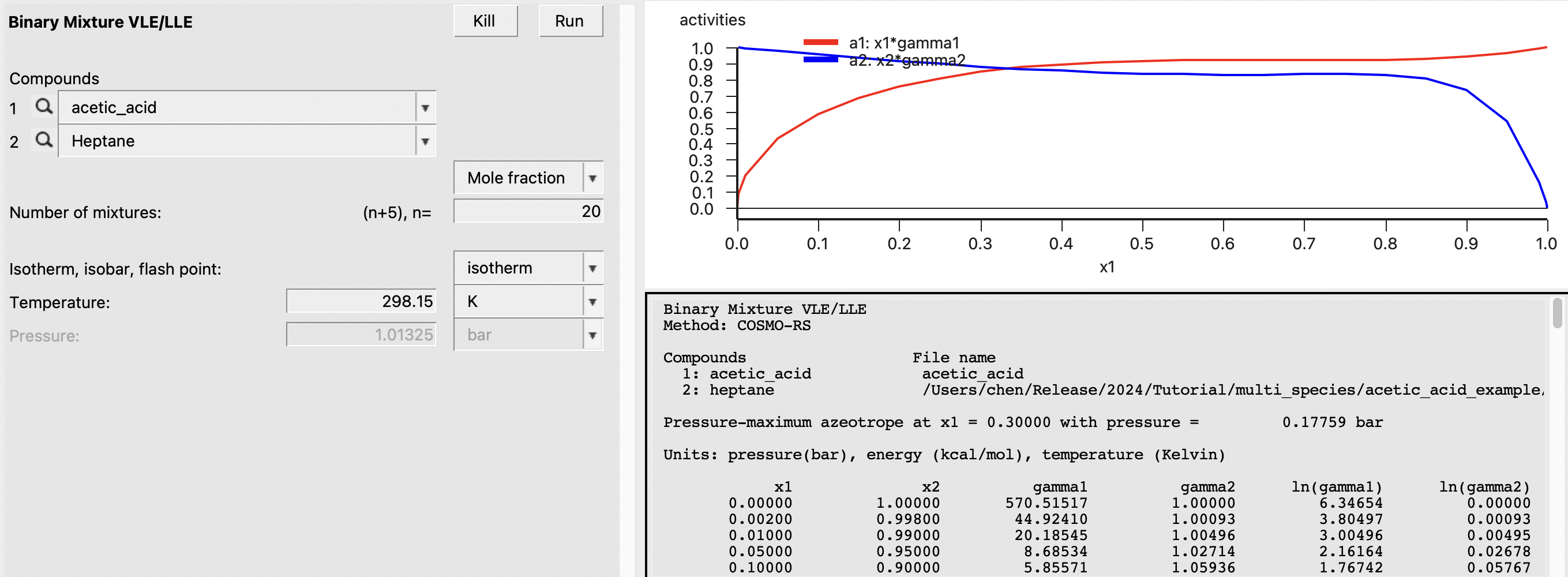 Now, we perform the same steps as above in the Binary Mixtre VLE/LLE module, except this time we will use the acetic_acid_conformers.multiform instead of acetic_2.coskf.