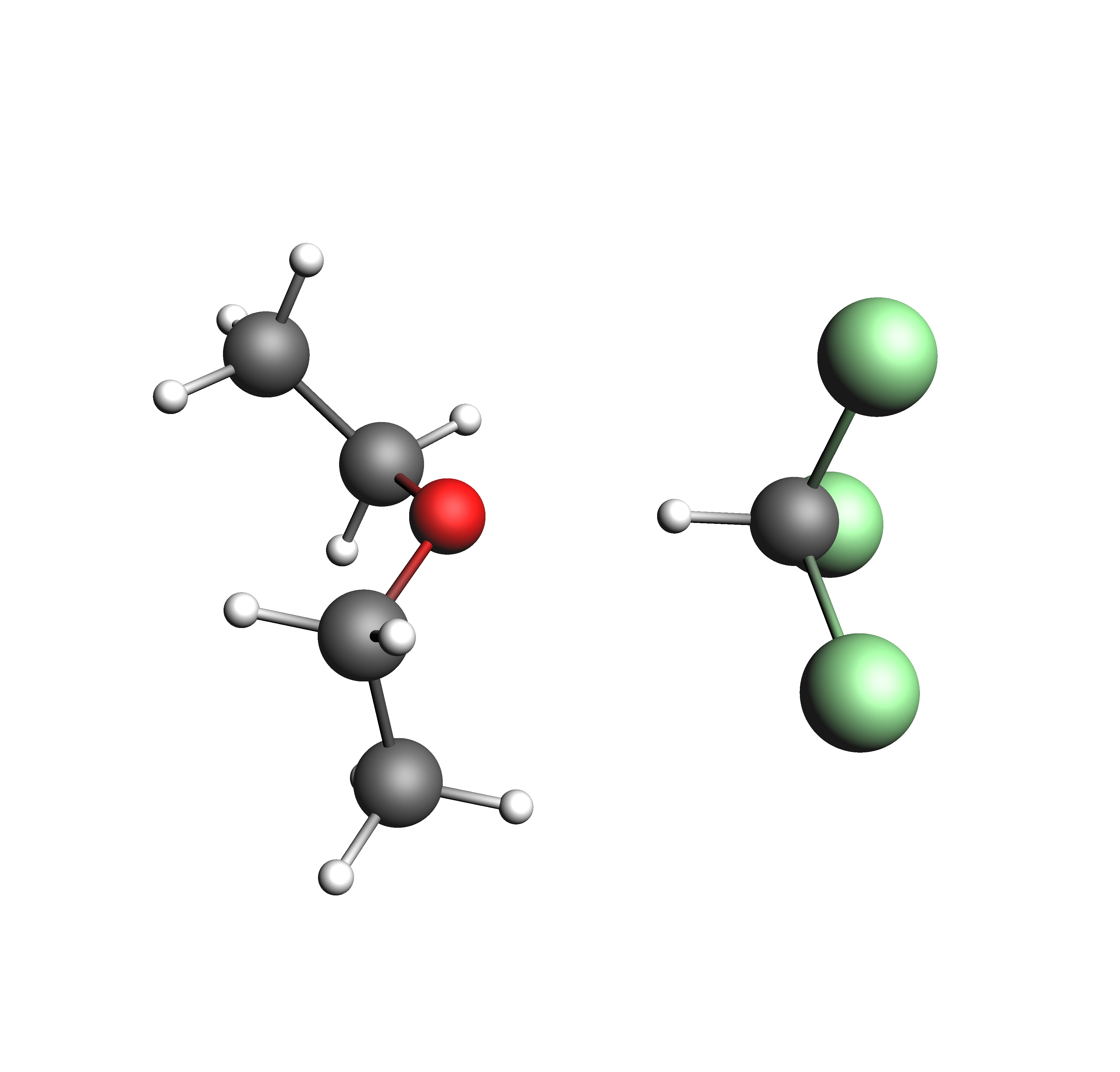 Structures used in the diethyl ether chloroform system: diethyl ether, chloroform, and the associated complex (clockwise from top left)