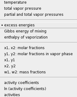 The results of the calculation are also given in the form of a table, which shows the molar (and mass) fraction of each compound in the liquid, the activity coefficients, the activities, the temperature, the total and partial vapor pressures, the molar fraction of each compound in the vapor (y), the excess Gibbs free energy GE , the excess enthalpy HE (calculated with the Gibbs-Helmholtz equation), the excess entropy of mixing -TSE , the Gibbs free energy of mixing Gmix , the enthalpy of vaporization Δvap H (calculated with the Clausius-Clapeyron equation).