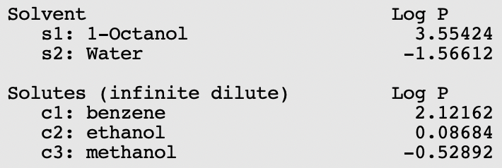 The activity coefficients a solvent and the activity coefficients of infinitely diluted solutes in a solvent can be calculated with Properties → Activity coefficients. At the same time Henry coefficients and solvation free energies will be calculated.