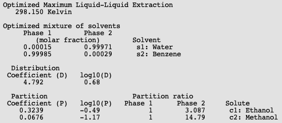 In this step a mixture of immiscible solvents is optimized in order to maximize or minimize the distribution ratio (D) of two solutes between the two liquid phases. A list of pure solvents should be provided. At least two of these solvent should be immiscible with each other. In this example we try to optimize the mixture of immiscible solvents for liquid-liquid extraction (LLE) of methanol and ethanol.