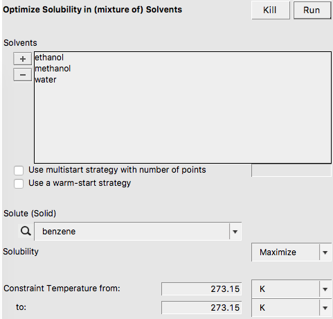In this step a solvent is optimized in order to maximize or minimize the mole fraction solubility of a solid solute in the liquid mixture. A list of pure solvents should be provided. The optimal solution might be one of the pure solvents, but might also be a mixture of these solvents. Note that if the optimal solution is a mixture of solvents, no check is done whether these solvents are in fact miscible. Note that for the solubility of a solid compound it is necessary to include the melting point and the enthalpy of fusion of the solid. First we try to optimize the solvents, such that it maximizes the solubility (mole fraction) of solid benzene