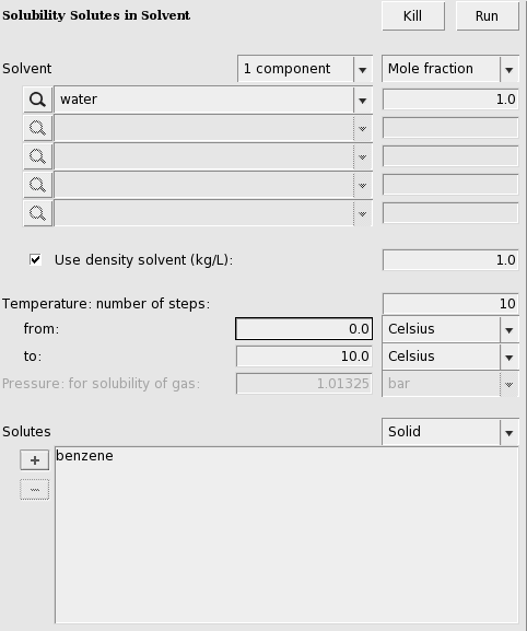 The solubility of a solute in a solvent can be calculated with Properties → Solubility in Pure Solvents or Properties → Solubility in Mixture. The solute can either be a liquid, solid, or gas.