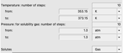 For the solubility of a gas one should the change the ‘Liquid’ popup menu in ‘Gas’ and enter a partial pressure in the ‘Pressure’ field.