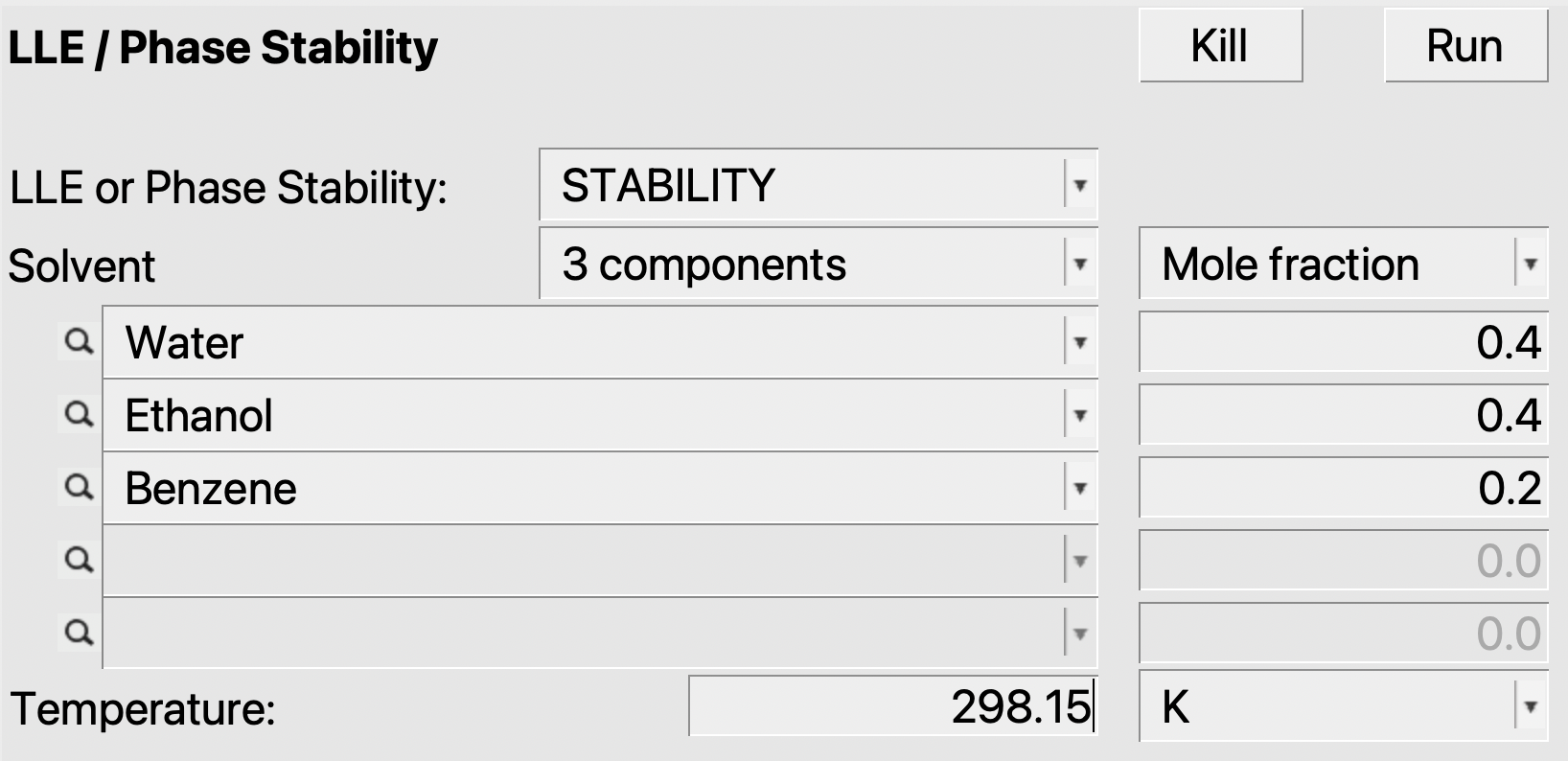 LLE0.40.40.2When phase splitting is detected in the build-in stability test, the LLE solver searches for a two-liquid-phase equilibrium that satisfies equality of component activities between the two liquid phases. The current algorithm considers only two liquid phases at equilibrium.