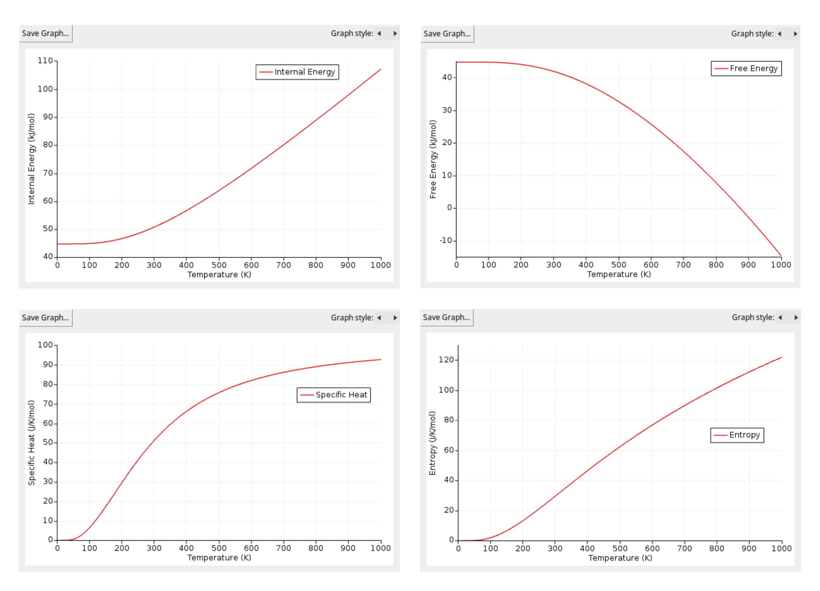 In these plots, double-click on the y-axis to change the units, for example, from Hartree to kJ/mol for internal energy and free energy, or from kB (Boltzmann constant units) to J/K/mol.
