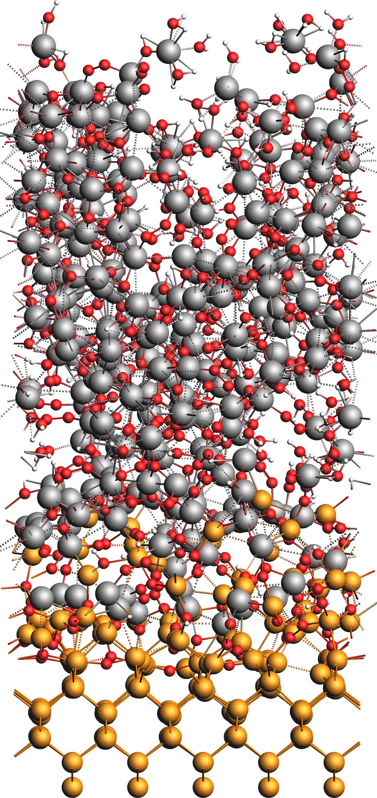 After the simulation, we obtain the model structure shown in the figure below. The original surface is covered by an amorphous interface layer followed by a thick but loose and alumina film with many absorbed water molecules and OH groups as well as several chemisorbed aluminum complex moieties on the surface of the film.