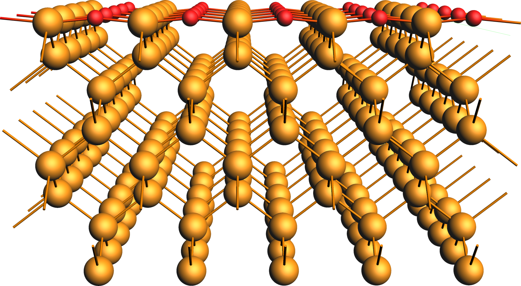 After converting the crystal to a surface slab model, the oxygen centers were added to the surface and relaxed in the following.