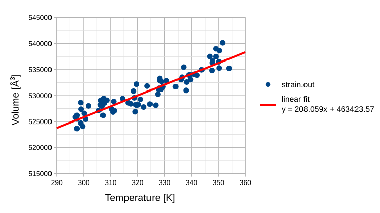 For the calculation of the thermal expansion coefficient we determine the volume change caused by increasing of the temperature. The data points will be sampled within the temperature range of 300-340K. Before the actual sampling, a short simulated annealing sequence was found produce less noisy results. However, if the sampling intervals are chosen long enough the simulated annealing can also be left out.