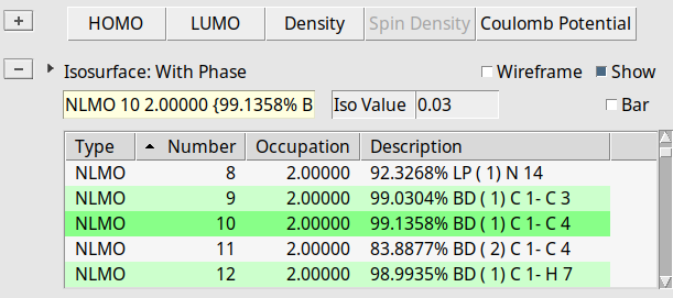 Opposed to that, the π-orbitals of the aromatic system can be clearly identified as well, e.g. for NLMO #11 in the above listing of contributions