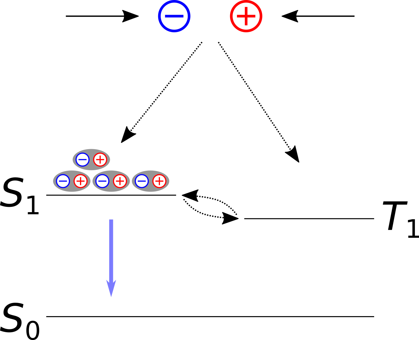 As free electrons (and holes) are equally likely to be created with spin up or spin down configurations, 75% of the formed excitons emerge in a triplet state (total spin \(S\) = 1) while 25% are found in a singlet state (\(S\) = 0).