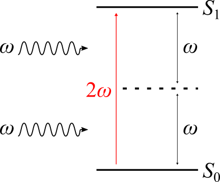 Fig. 44 Schematics of the levels involved in a two photon absorption (TPA) process exciting an absorbing system from its ground state \(S_{0}\) to an excited state \(S_{1}\).¶