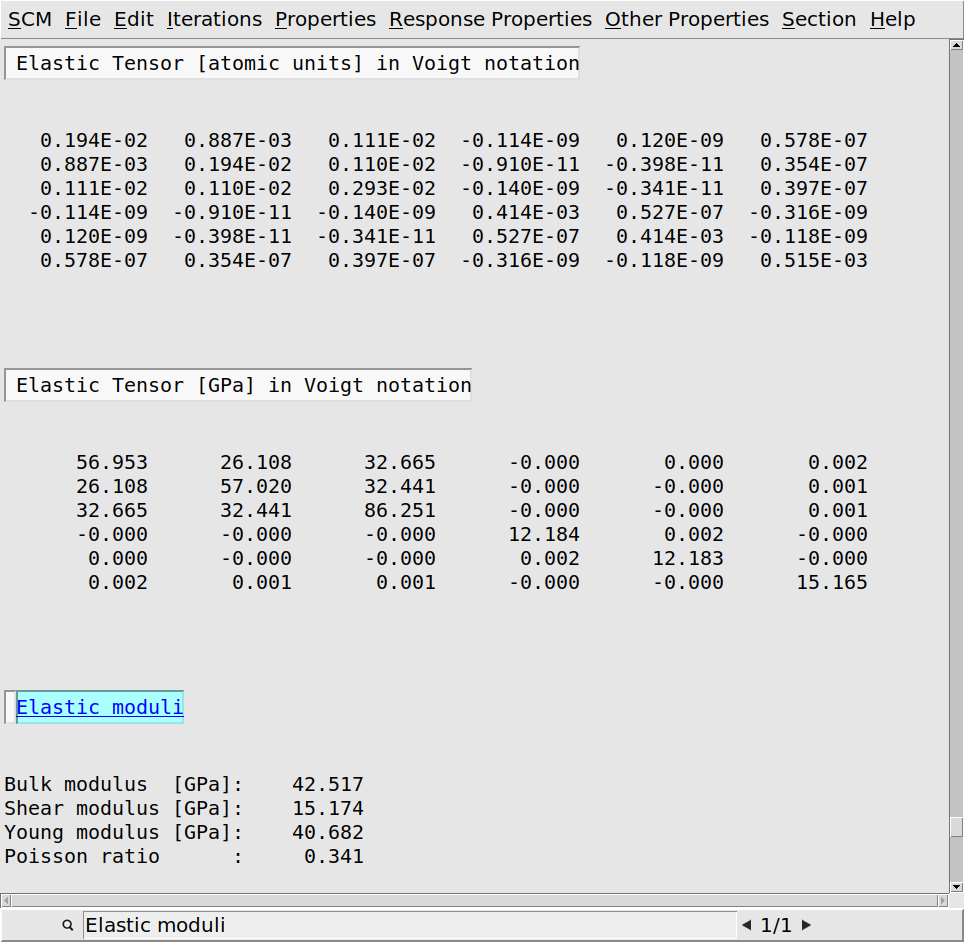 If you scroll through the logfile you will see the lines containing Elastic tensor: optimizing strained system followed by a number. These are the 84 individual geometry optimization of the strained systems we mentioned in the introduction of this tutorial. Note that unless you are running the job completely serially you will not see all of these 84 optimizations in the logfile: As the individual optimizations are completely independent from each other, they will automatically be parallelized at the AMS driver level. Technically all available CPU cores are split up into groups. Cores in one group work together on a single optimization, and after finishing it will move on to the next independent optimization that has not yet been picked up by another group. The logfile you see is written by one of these groups (the one that contains the first CPU core on the first node), so you only see the messages relating to the optimizations that have actually been picked up by that specific group. The parallel part only ends when all 84 optimization have been picked up by a group, and the last group still working has finished its last optimization. At this point all groups merge again, the results are collected, and the elastic tensor calculated.