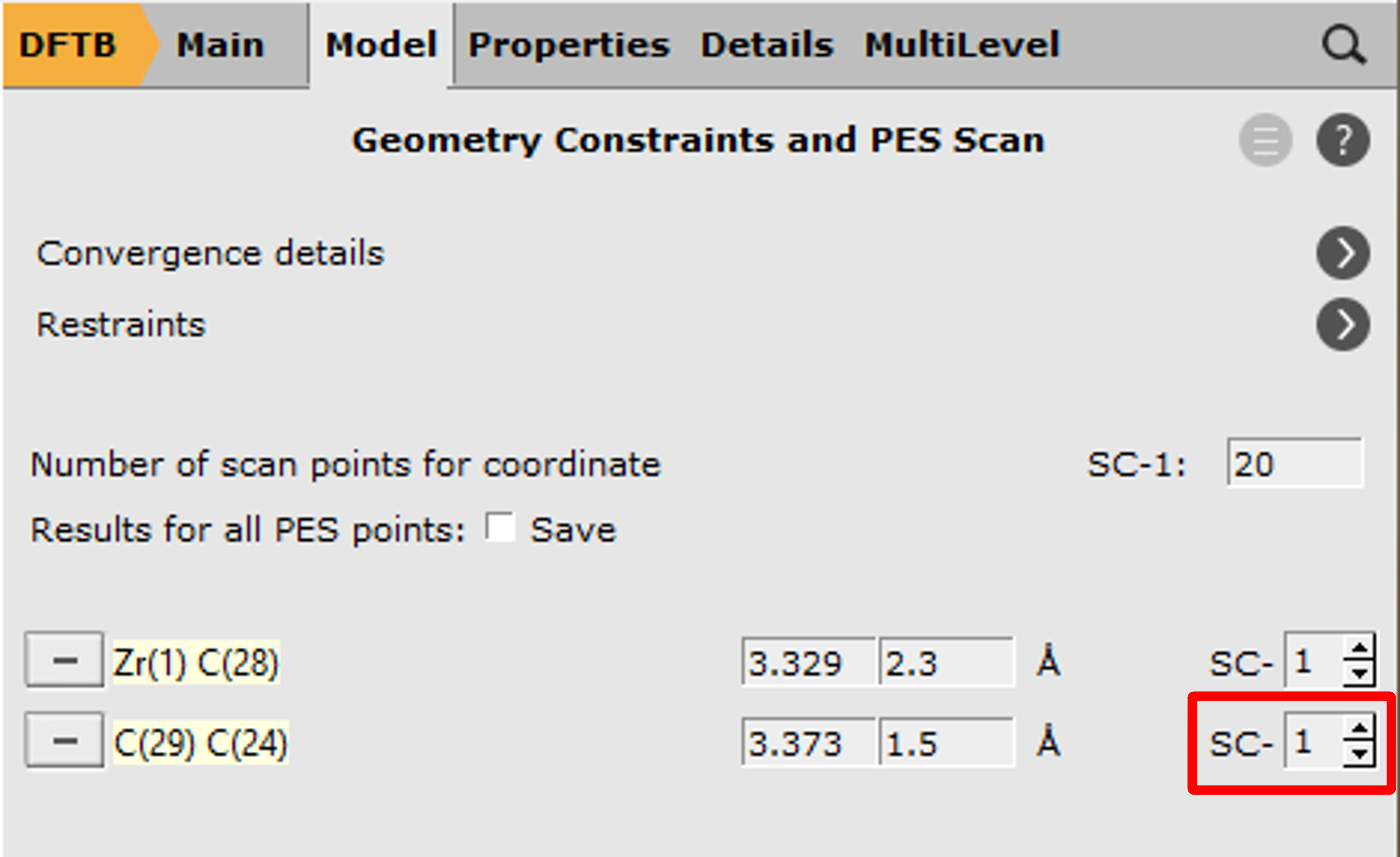These two distances will serve as scan coordinates and these will be scanned starting from their present values down to the distance of a typical Zr-C (measured from Zr-Methyl: ~2.3 Å) and Carbon-Carbon single bond (~1.5 Å).