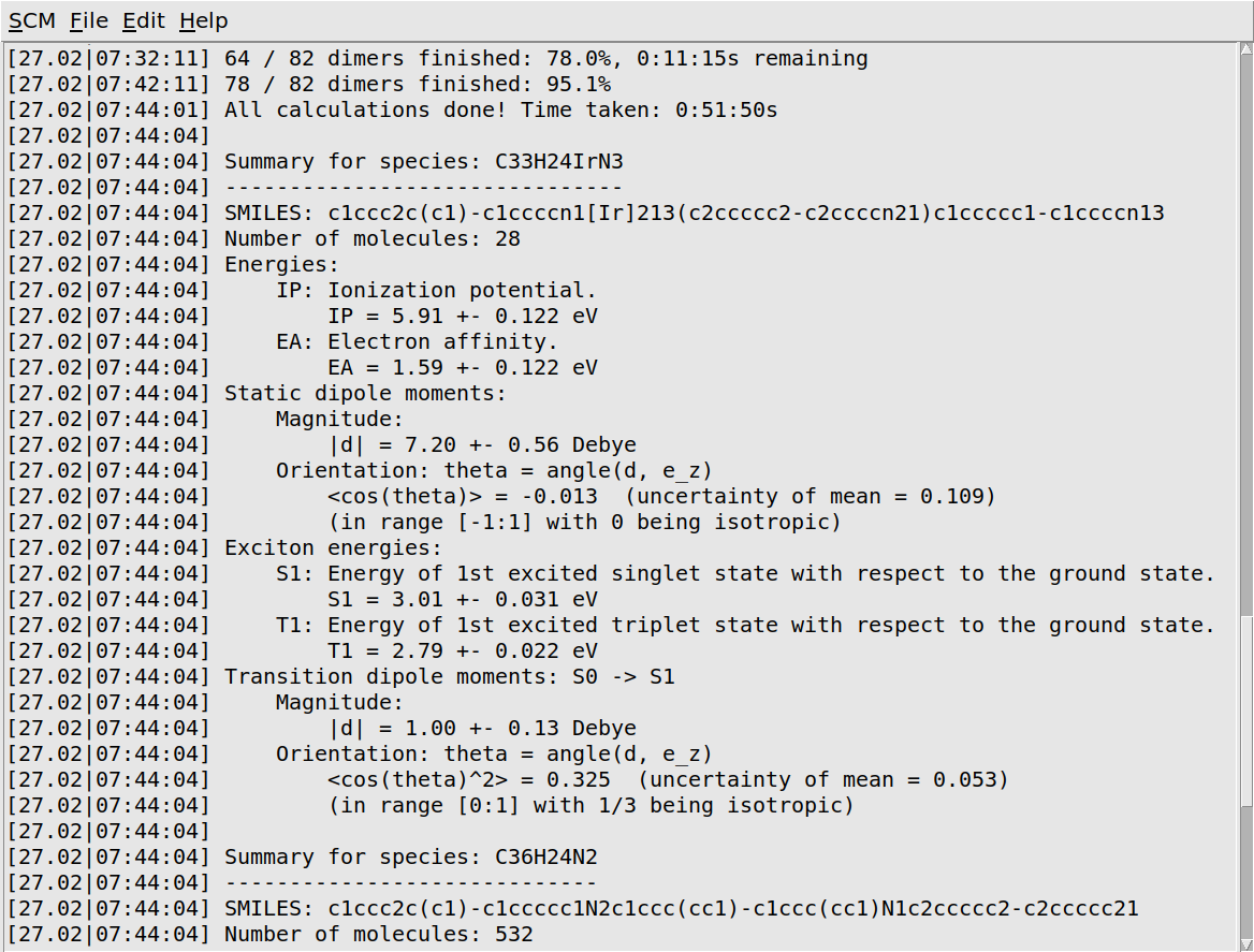 If you do not want to wait for the calculation to finish, you can download the files here (HDF5) and here (YAML) or take them from the OLED material database, where it is stored as host+guest/CBP+fac-Irppy3/properties.{hdf5,yml}.