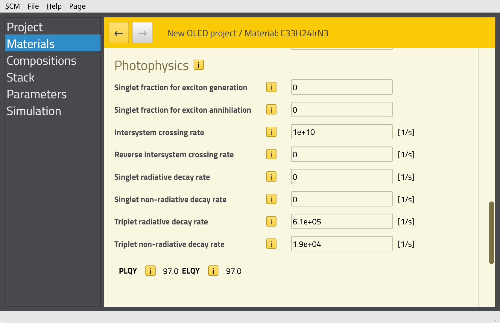 In order to include emission from Ir(ppy)3 in the simulation, we need to specify the decay rates on the Materials page. We will use the experimental parameters provided in the Bumblebee tutorials.