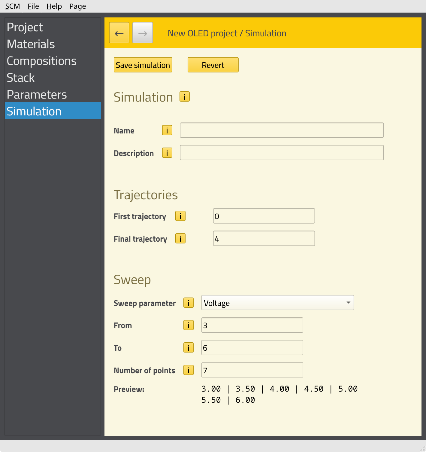 In this tutorial, we want to perform a voltage sweep. This means multiple kMC simulations will be started at different voltages in order to construct the J-V curve for the device. Later, we can analyze the processes inside the stack at each of these voltages. This parameter sweep is set up on the Simulation page.