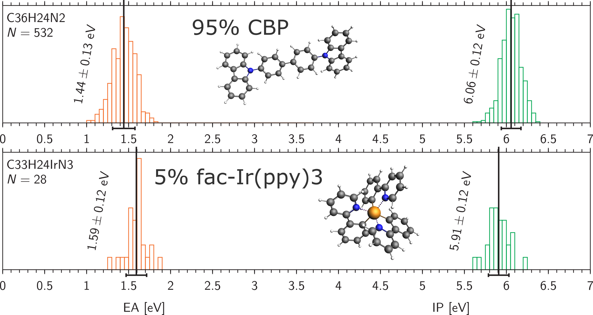 Once we have obtained the morphology, we can use it to run the OLED properties workflow and obtain material properties such as ionization potential and electron affinity.