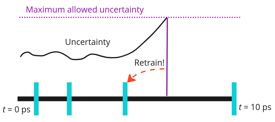 Fig. 4 Example: You train a committee model that estimates the model’s uncertainty. As soon as the uncertainty increases above a given threshold, the MD simulation stops. The model is retrained and the simulation rewinds to the previous active learning step.¶