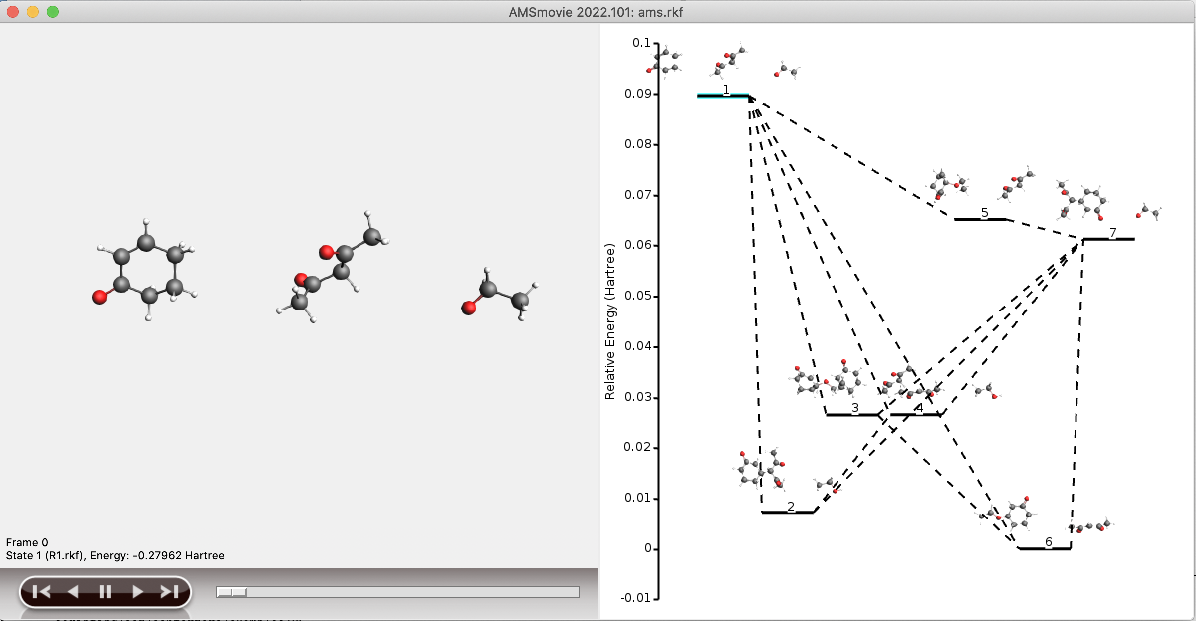 Since the full reaction network is often too large to conveniently visualize, a separate network is stored containing only the shortest paths from reactant to product. This subnetwork is stored in the folder plams_workdir/acerxn/shortest_paths. Generally, viewing the shortest paths in AMSMovie should yield a good overview of the structures involved in, and the potential energy profile of, the shortest paths.