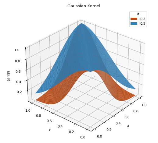 \[k(x, y) = \exp\left[ - \frac{(x - y)^2}{2\sigma^2} \right]\]