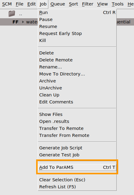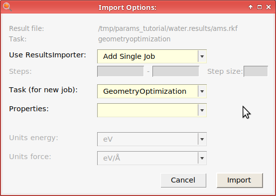 Choosing Job → Add to ParAMS (Ctrl-T) in AMSjobs or Jobs → Add Job (choosing an ams.rkf, OUTCAR, or quantum-espresso.out file) in the ParAMS GUI. This brings up a ResultsImporter dialog and is the recommended way to import a job into ParAMS. In the dialog you can directly import results like energies, forces, stress tensor, charges, bond scans, angle scans, volume scans, and any other PES scan. It is recommended to use the dialog to import those results.