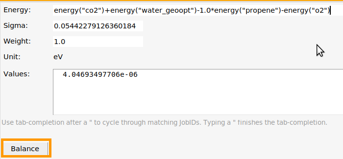 Then, add the reaction energy. You can either work out the stoichiometric coefficients yourself, or use the automatic Balance feature of ParAMS (see below).