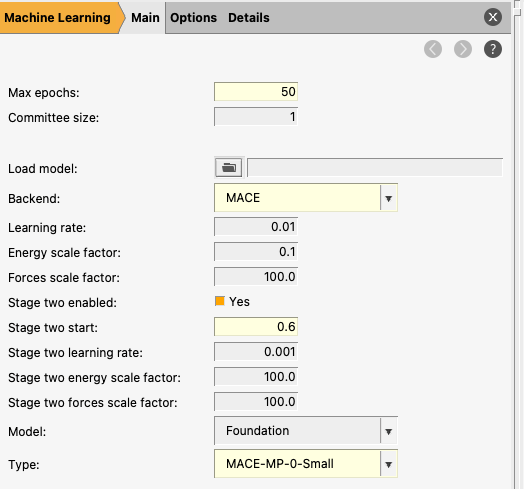 Foundation: this starts the training from one of the pretrained MACE models. This typically makes training much faster. You cannot, however, change the architecture parameters.