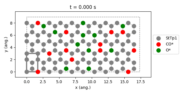 { "Time":[0.0, 0.1, 0.2, ...], "O*":[5, 15, 20, ...], "CO2":[10, 25, 45, ...] }species_name– List of species names to show, e.g.,["CO*", "CO2"]normalize_per_site– Divides the molecule numbers by the total number of sites in the lattice.