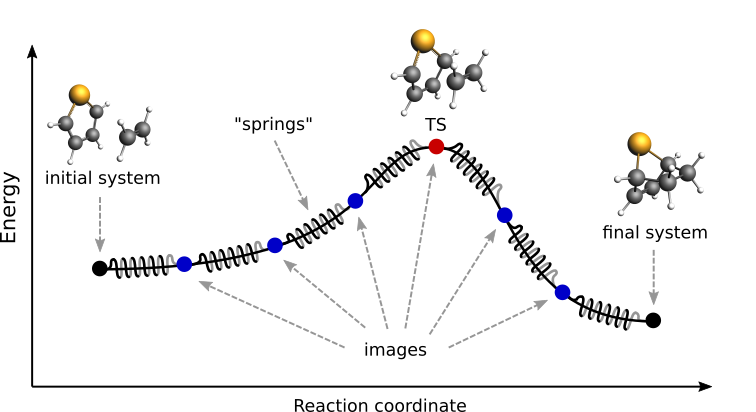 Finally, a reaction path is found by performing a simultaneous optimization of all the images. In the NEB method the images are not independent from each other. The force on each image depends on its neighboring images: at each step the forces parallel to the reaction path are eliminated and a so-called spring force is added that tries to keep each image in the middle between its neighbors. This does not let images slide to the initial or final reaction state and ensures that they are evenly distributed along the reaction path.