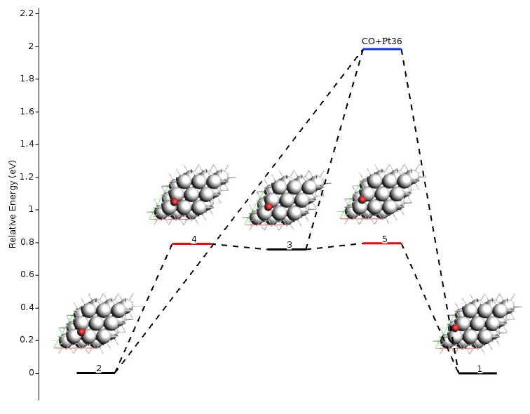 Lines connecting the the binding sites will be drawn if 1) there is a transition state connecting two local minima associated to these binding-sites (notice that may there are multiple local minima associated with the same binding site), and 2) there is at least an atom (from the adsorbate region) that changes its position from the first binding site to the second one mediated by the same transition state described above. In this process, AMS will align as much as possible all local minima and transition states to the input’s file structure but ignoring the atoms in the region adsorbate trying to establish a common reference frame (see also the StatesAlignment input block below).