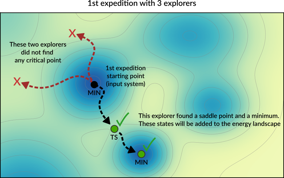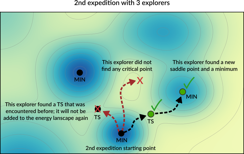 By having many explorers you will have a higher chance of comprehensively mapping the PES near the starting point of each expedition. By having many expeditions, you will have a higher chance of traveling further away from the initial structure.