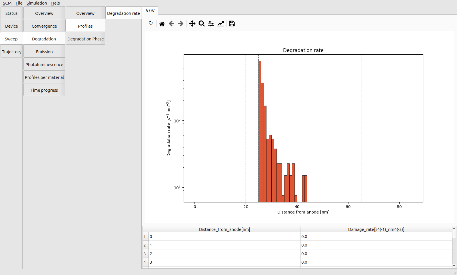 Inspect the distribution of degradation events across the device in the Sweep → Degradation → Profiles → Degradation Rate tab.
