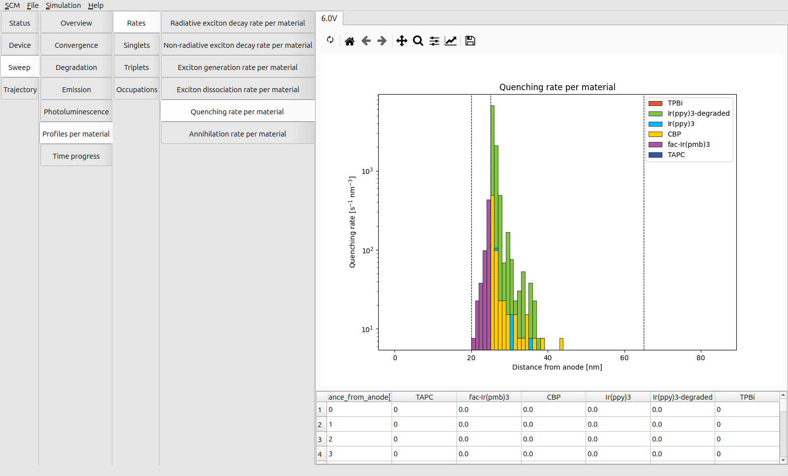 The dominant degradation mechanism is triplet-polaron quenching (TPQ), as seen by comparing the Sweep → Profiles per Material → Rates → Quenching and Annihilation profiles. This is attributed to the high density of polarons compared to the exciton density required for triplet-triplet annihilation (TTA).