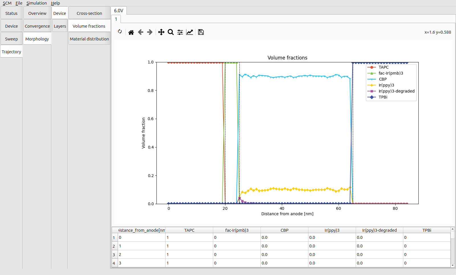 The Trajectory → Morphology → Device → Cross-section view can also be used to visualize the exact distribution of materials inside the stack.