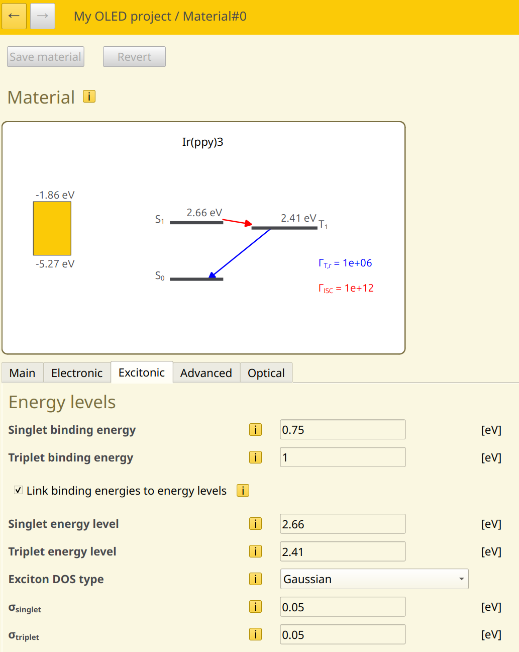 We will set a singlet binding energy of 0.75 eV and a triplet binding energy of 1 eV. By enabling the option to link the singlet and triplet binding energies, the exciton energy levels will be computed automatically based on the exciton binding energy and the HOMO/LUMO levels.