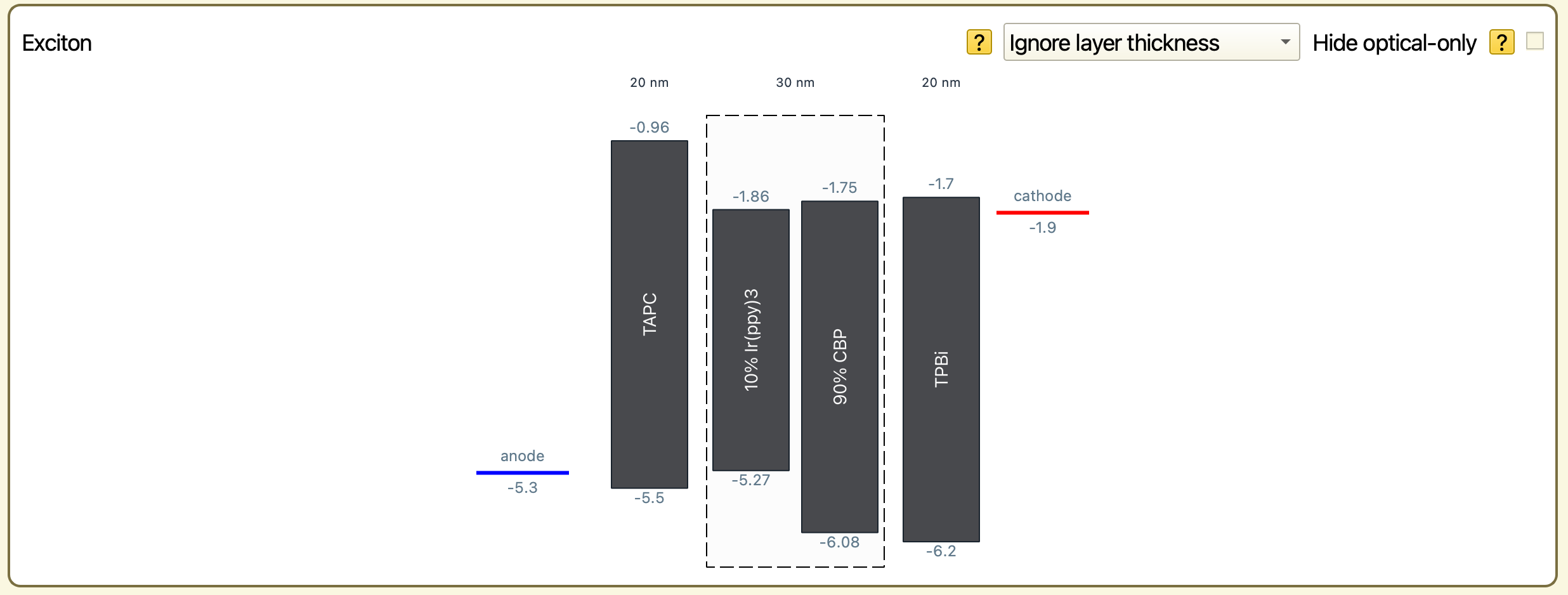 We start by composing the stack layers. We use a 20 nm TAPC hole transport layer, a 30 nm host-guest layer in the center and a 20 nm TPBi electron transport layer.