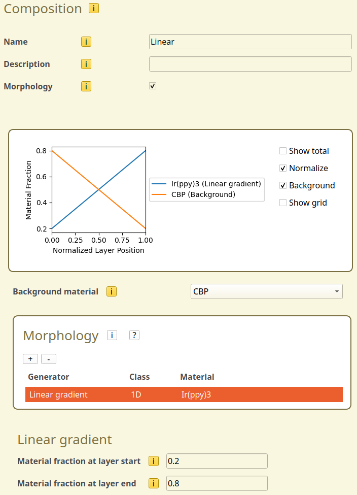We will use the linear gradient generator to add an Ir(ppy)3 dye to the CBP host. The material can be changed to Ir(ppy)3 in the Morphology table. Note that when the Linear gradient is selected, a new editor will appear at the bottom of the page. This editor allows us to modify the gradient.