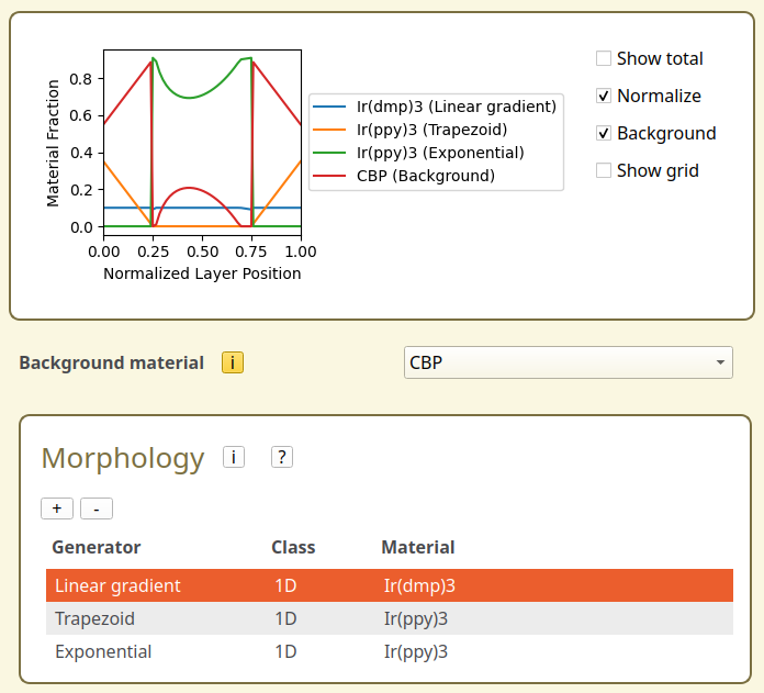 CBP is used as the host material and is therefore set as the background material. We will use a Linear generator to create a static Ir(dmp)3 fraction of 0.1. The Trapezoid is used to add an Ir(ppy)3 gradient at the edges. The Exponential gradient is used to add a dense Ir(ppy)3 region to the center of the layer.
